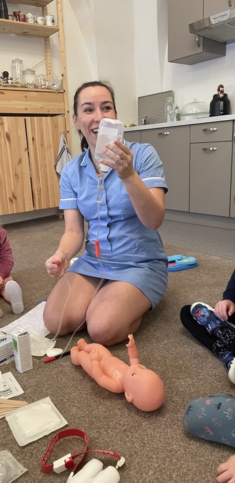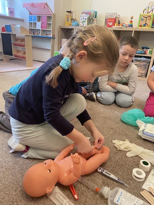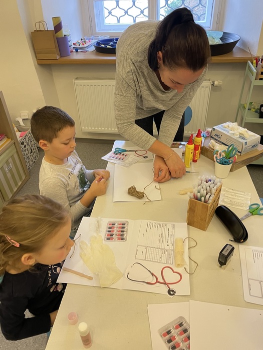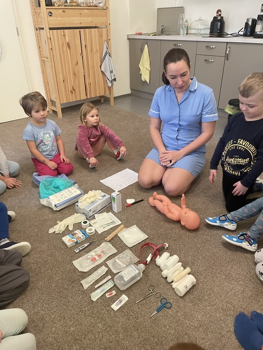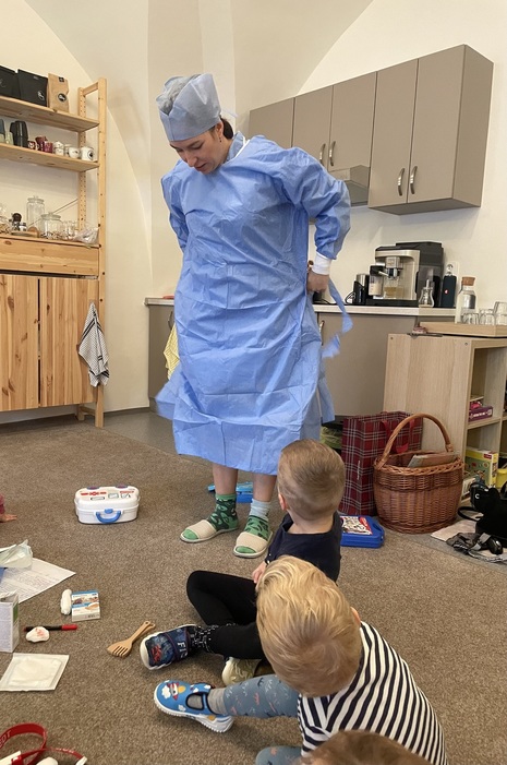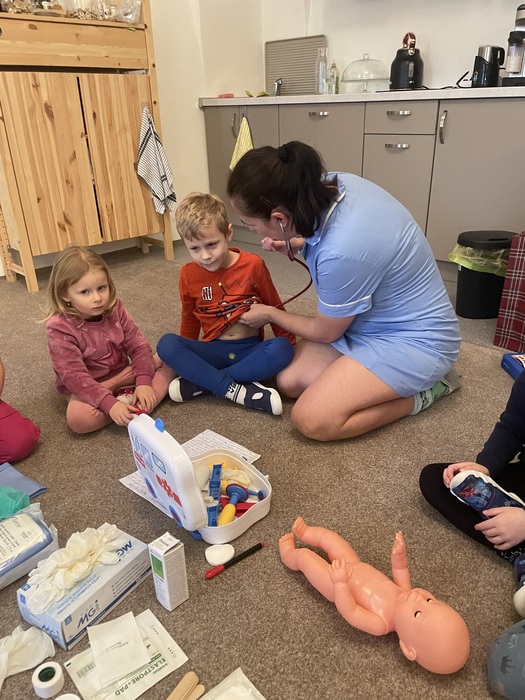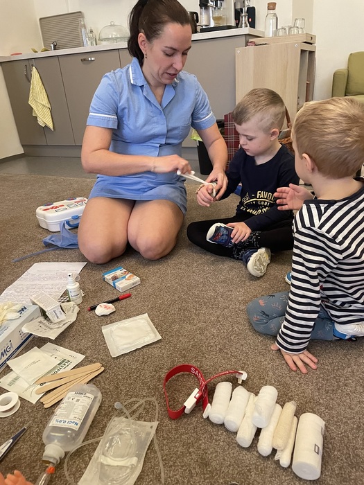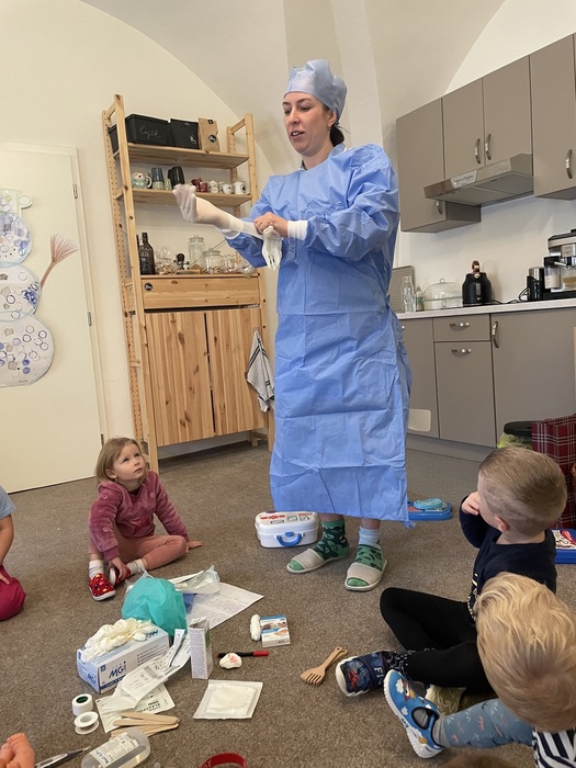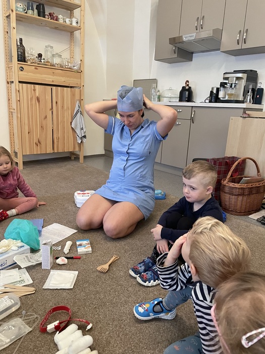 Ve školce si nyní povídáme o povinnostech dospělých… Dostali jsme se i k jejich práci… Využili jsme nabídku aktivní maminky, která zastává profesi zdravotní sestřičky… Pozvala nás do Rodinného centra Madita, kde nás přivítala v šatech zdravotní sestřičky… Dětem zjednodušeně vysvětlila úkoly zdravotní sestřičky a ukázala mnoho pomůcek a reálného zdravotnického materiálu… Paní Gálová ukázala také správné ošetření úrazu, zlomeniny a popáleniny… Zopakovala všechna telefonní čísla integrovaného záchranného systému… Po té byla pro děti připravena dílnička, kde si mohly vyrobit vlastní lékárničku nebo nakapat na lidské tělo z vaty krevní oběh… Bohatě jsme si užili i kvalitních hraček v herničce Rodinného centra… Velké poděkování patří Rodinnému centru Madita, paní Gálové a celé její rodině…